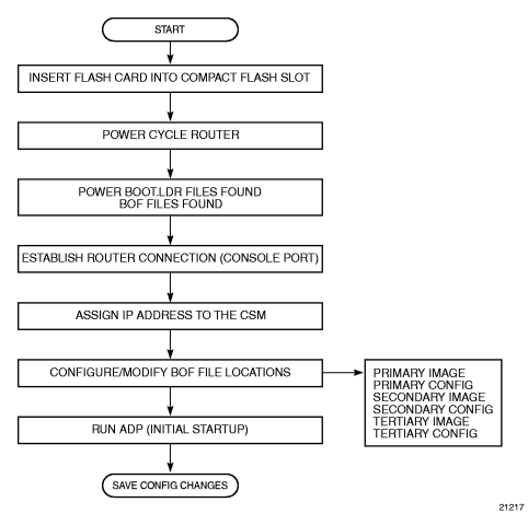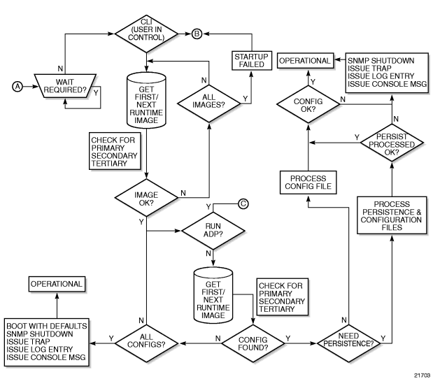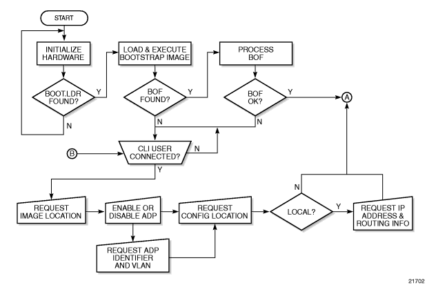 Figure 8 displays the process to start the system. This example assumes that the boot loader and BOF image and configuration files are successfully located.