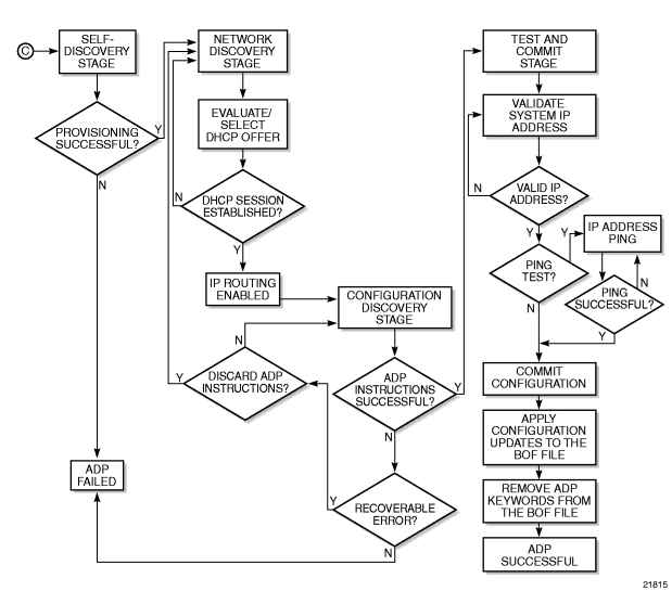 Any temporary configuration done by ADP is not stored; however, network configuration and remote access remain enabled to allow the router to be manually provisioned remotely. ADP does not run again on future system reboots unless it is re-enabled via the CLI. If a standby CSM with ADP enabled is inserted into a running system that does not have the ADP keyword in its BOF file, the ADP keyword is automatically removed from the inactive card’s BOF file during reconcile.
