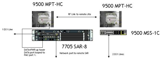 In this configuration, a 7705 SAR-8 will connect to a far 9500 MSS-1C to provide DS1 services. One DS1 will terminate on the 7705 SAR-8, and another will terminate on a remote device, in this case another SAR.