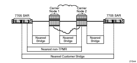 Figure 22 shows the three scopes of LLDP that are supported on the 7705 SAR. The scopes are Nearest Bridge, Nearest non-TPMR Bridge, and Nearest Customer Bridge.