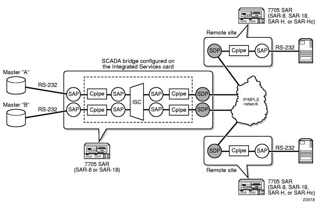 In a SCADA MDDB network, the masters and slaves are connected to a SCADA bridge using RS-232 links. The masters are typically located on remote servers that are physically connected to a 7705 SAR-8 or 7705 SAR-18 using the 12-port Serial Data Interface card. The slaves are at a remote location connected to a 7705 SAR-8, 7705 SAR-18, 7705 SAR-H, or 7705 SAR-Hc node. On a 7705 SAR-8 or 7705 SAR-18, the physical connection is made using the 12-port Serial Data Interface card. On the 7705 SAR-H, the 4-port T1/E1 and RS-232 Combination module is used; on the7705 SAR-Hc an on-board RS-232 serial port is used. The remote nodes are connected to the SCADA bridge over an IP/MPLS network.