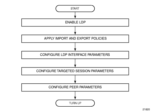 MPLS must be enabled when LDP is initialized. LDP makes sure that the various prerequisites are met, such as ensuring that the system IP interface and the label manager are operational, and ensuring that there is memory available. It then allocates a pool of memory to itself and initializes its databases.