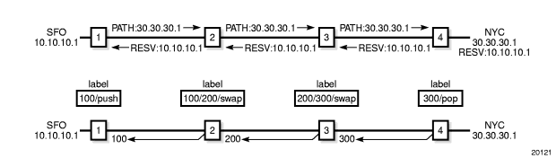RSVP-TE uses the Downstream on Demand (DOD) label distribution mode, sending PATH messages from the ingress LER node to the egress LER, and RESV messages in the reverse direction. DOD label distribution is a router’s response to an explicit request from another router for label binding information. The DOD mode is in contrast to LDP on the 7705 SAR, which uses the Downstream Unsolicited (DU) label distribution mode for both PWs and LSPs. A router in DU mode will distribute label bindings to another router that has not explicitly requested the label bindings.