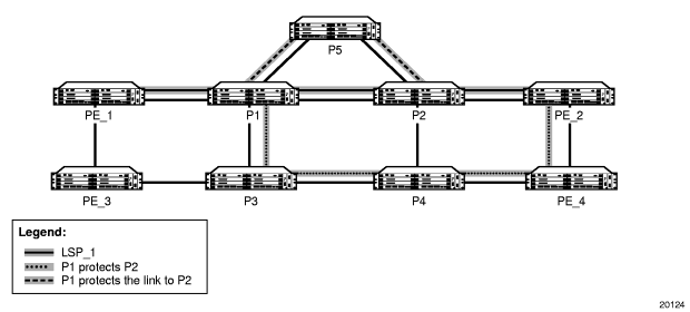LSP_1 had requested node protection, but due to lack of an available path it could only obtain link protection. Therefore, every 60 s, the PLR for LSP_1 will search for a new path that might be able to provide node protection. Once P4 is back online and such a path is available, a new bypass tunnel will be signaled and LSP_1 will be associated with this new bypass tunnel.