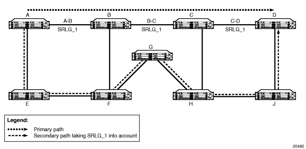 Figure 7 illustrates SRLG when LSP redundancy is used, where SRLG_1 contains the interfaces that define links A-B, B-C, and C-D. The primary path uses these links to connect node A to node D. In the event of a failure along the primary path, the secondary path cannot use any of the links in SRLG_1 and takes the path from node A to nodes E, F, G, H, J, and D.