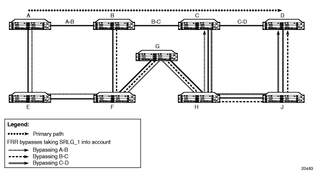 Figure 8 illustrates SRLG when FRR bypass is used, where SRLG_1 is the same as in Figure 7. Since FRR bypass is used, the following possible reroutes may occur, depending on where the failure occurs: