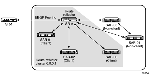 In Figure 13, SAR-04 and SAR-05 are shown as non-clients of the route reflector. As a result, a full mesh of IBGP peerings must be maintained between SR-A, SAR-04, and SAR-05.