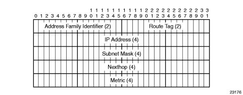 There can be 1 to 25 route entries. The RIP packet header format is displayed in Figure 16. Figure 17 and Figure 18 display the RIPv1 and RIPv2 packet formats.