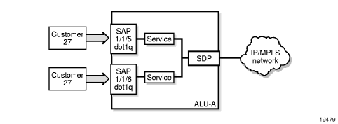 A SAP identifies the customer interface point for a service on a 7705 SAR router. Figure 2 shows one customer connected to two services via two SAPs. The SAP identifiers are 1/1/5 and 1/1/6, which represent the physical ports associated with these SAPs. The physical port information should be configured prior to provisioning a service. Refer to the 7705 SAR OS Interface Configuration Guide for more information about configuring a port. See Port and SAP CLI Identifiers for more information about identifiers.