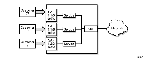 A service access point (SAP) is the point at which a service begins (ingress) or ends (egress) and represents the access point associated with a service. A SAP may be a physical port or a logical entity within a physical port. For example, a SAP may be a channel group within a DS1 or E1 frame, an ATM endpoint, an Ethernet port, or a VLAN that is identified by an Ethernet port and a VLAN tag. Each subscriber service connection on the 7705 SAR is configured to use only one SAP.