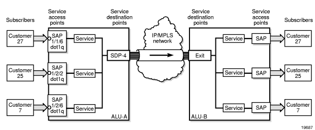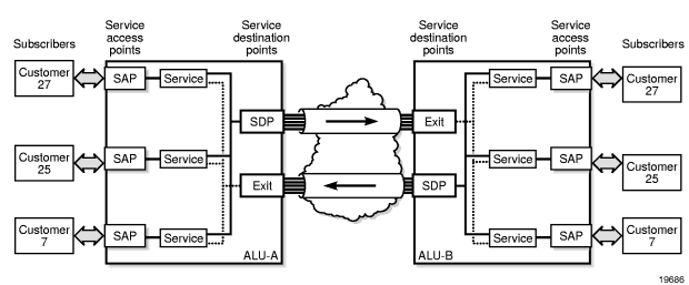 Figure 1 shows an example of how the service entities relate to the service model. A subscriber (or customer) attachment circuit connects to a SAP. SDPs define the entrance and exit points of unidirectional service tunnels, which carry one-way traffic between the two routers (ALU-A and ALU-B). After SDPs have been configured, they are bound to a service, which is the final step in making the end-to-end service connection. In Figure 1, the entrance point is labeled SDP and the exit point is labeled Exit.