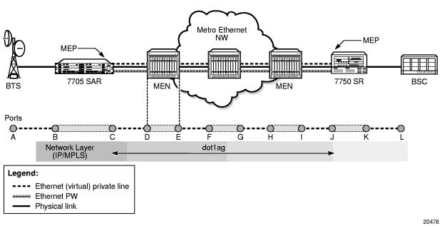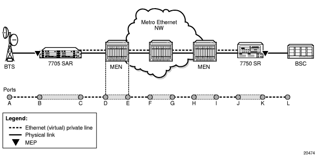 Figure 19 shows how a Down MEP on an Ethernet SAP might be used. In this example, an Ethernet network connects to an access Ethernet port on the 7705 SAR and there are multiple SAPs on that port (that is, multiple endpoints). Since CFM offers OAM capabilities on a per-service basis, which in this case means per SAP (or endpoint), each service can run CFM. Note that if BSC end devices were directly connected to the 7705 SAR (and a VLAN was not used to separate services from each other), EFM would offer capabilities similar to CFM for Ethernet OAM.