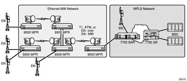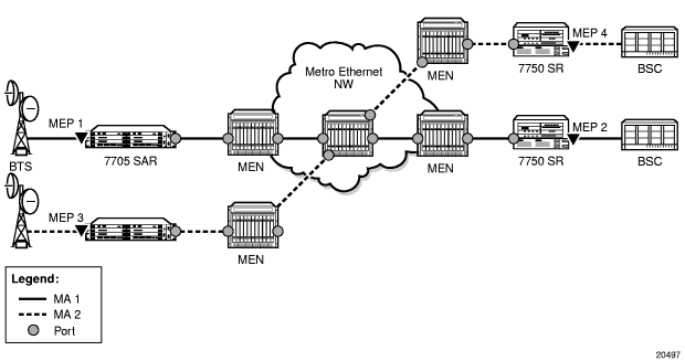 In the example shown in Figure 19, separate dot1ag instances initiated on the 9500 MPR nodes can be used to ensure Ethernet layer connectivity on a per-base-station basis. All the traffic from these base stations is aggregated and switched to a single port on the 7705 SAR. Each base station is recognized through a different VLAN, where the VLANs are bound to different services. CFM with traffic in the Down MEP OAMPDU direction at the Ethernet SAP offers the flexibility to run OAM tests on a per-base-station basis.