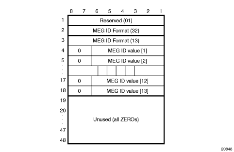 The MEG-ID value has exactly 13 characters and consists of two subfields, the ITU Carrier Code (ICC) followed by a Unique MEG-ID Code (UMC). The ITU Carrier Code consists of between 1 and 6 left-justified characters (alphabetic or leading alphabetic with trailing numeric). The UMC code immediately follows the ICC and consists of between 7 and 12 characters, with trailing NULLs (if necessary to complete the 13 characters).