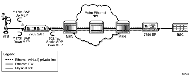 The 7705 SAR supports Up and Down maintenance association endpoints (MEPs) on Ethernet SAPs for both 802.1ag and Y.1731. It also supports Down MEPs on Ethernet spoke SDPs for 802.1ag only.