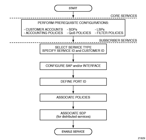 Figure 26 shows a flowchart that provides an overview of the process to create a service. Service creation can be separated into two main functional areas—core services tasks and subscriber services tasks. Core services tasks are performed prior to subscriber services tasks.