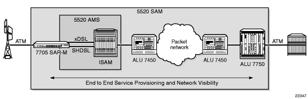 The 7705 SAR routers are deployed at the provider edge (PE). Services are provisioned on the 7705 SAR and other network equipment in order to facilitate the transport of telecommunications data across an IP/MPLS provider’s core network. The data is formatted so that it can be transported in encapsulation tunnels created using generic routing encapsulation (GRE), IP encapsulation, or MPLS label switched paths (LSPs).