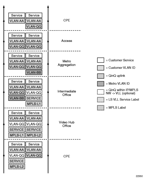 On the 7705 SAR, QinQ (also referred to as VLAN stacking) is based on the IEEE 802.1ad specification. QinQ allows a service provider to use a single VLAN for customers needing multiple VLANs by adding a second VLAN tag to an Ethernet frame, as shown in Figure 22. QinQ encapsulation can be thought of as a dot1q within a dot1q encapsulation.
