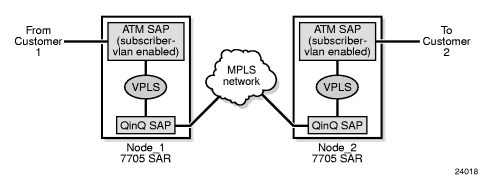 A second example of triple-tag behavior is shown in Figure 25, where customers are connected using ATM SAPs with subscriber-vlan enabled.