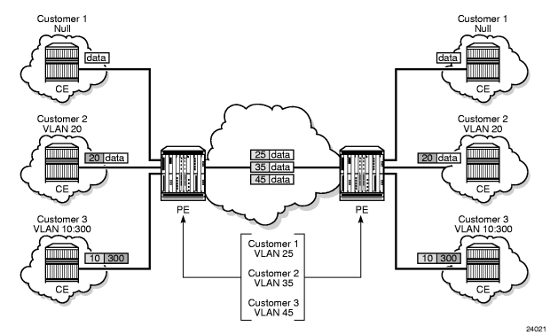 Figure 23 shows an example of QinQ tagging, where three customer sites each use the same service provider PE router to transport multiple VLANs across an MPLS network. Customer 1 sends an Ethernet frame without a VLAN tag (null encapsulation) and the provider uses MPLS label 25. Customer 2 sends dot1q frames (VLAN ID 20) and the provider uses MPLS label 35. Lastly, customer 3 sends a qinq frame (VLAN ID 10:300) and the provider uses MPLS label 45.