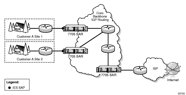 IES provides IP connectivity between customer access points. From the customer’s perspective, IES provides a direct IP connection and can be used for Internet connectivity, as shown in Figure 83. The customer is assigned an IP interface and a SAP is associated with the IP interface to designate a customer access point to the service—one SAP per interface. SAPs can be MC-MLPPP, PPP/MLPPP, LAG, or null/dot1q/qinq Ethernet. SDPs are not required, because traffic is routed rather than being encapsulated in a tunnel.