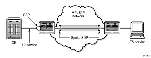 This feature enables a customer to exchange traffic between a VLL or VPLS (Layer 2) service and an IES or VPRN (Layer 3) service. Customer premises traffic coming in from a VLL or VPLS service (SAP to spoke SDP) is forwarded over the IP/MPLS network to the IES or VPRN service, and vice versa. Network QoS policies can be applied to the spoke SDP to control traffic forwarding to the Layer 3 service.