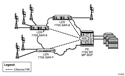 Figure 86 shows an example of backhauling from a given site that uses PW and IES on the 7705 SAR. An individual PW is configured on a per-CE device or a per-service basis. For routing services, this PW can be terminated to an IES at the 7750 SR end. This scenario offers per-service OAM and redundancy capabilities. Because there is no local communication on the remote 7705 SAR, traffic between any two devices connected to the 7705 SAR must traverse through the 7750 SR at the MTSO/CO.