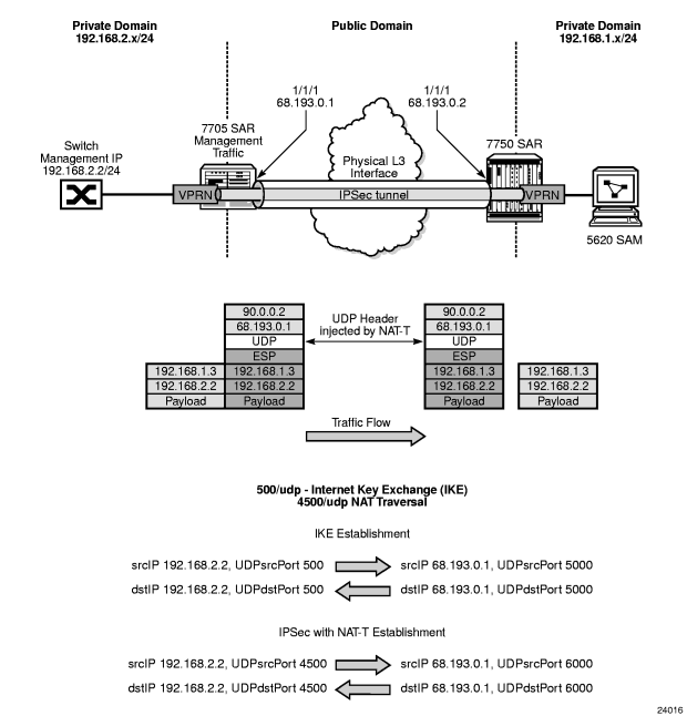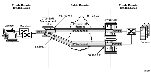 For IPSec, the 7705 SAR supports VPRN for the private side of the tunnel and IES for the public side of the tunnel. A public service instance (IES) connects to the public network and a private service instance (VPRN) connects to the private network, which originates the traffic that is to be encrypted (see Figure 99).