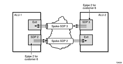 Figure 69 shows an example of a distributed Epipe service configuration between two routers, identifying the service and customer IDs and the unidirectional SDPs required to communicate to the far-end routers. The spoke-sdp sdp-id:vc-id must match on both sides.