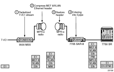 When TDM2Ethernet transport is required, the 9500 MSS packetizes the TDM2Ethernet stream using a MEF 8 frame format; the 7705 SAR-8 or 7705 SAR-18 acts as the MEF 8 endpoint. From a packet flow perspective, the TDM2Ethernet MEF 8 stream is a VLAN flow that can be handled by a VLAN SAP into an Epipe service going into the 7705 SAR-8 or 7705 SAR-18. To optimize the microwave bandwidth for the TDM2Ethernet MEF 8 transport, the packet header is compressed at the ingress MPR-e radio (connected to the 9500 MSS) and restored at the egress MPR-e radio (connected to the 7705 SAR-8 or 7705 SAR-18). In order for the egress MPR-e radio to perform this function, the parameters listed below are configured for an Epipe SAP on a 7705 SAR-8 or 7705 SAR-18; see Epipe Service Configuration Commands for more information:
