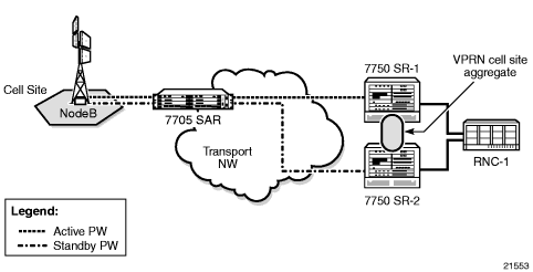 Figure 74 shows a PW-based backhaul option for mobile operators, where 7705 SAR-initiated Ethernet PWs terminate at 7750 SR nodes. In most cases, the 7705 SAR-initiated PWs terminate into a VPRN or IES service for routing purposes, or into a VPLS service for MAC forwarding purposes. PW termination into VPLS prevents unwanted exposure of IP addresses and eliminates concerns about the effect of IP addresses that change, thereby avoiding reconfiguration of the VPRN or IES access interfaces and routing entries.