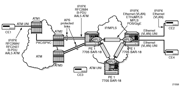 The application shown in Figure 81 provides access to a VPLS service for ATM users connected either directly or through an ATM access network to a 7705 SAR PE node. The 7705 SAR supports an ATM VC-delimited SAP terminating on a VPLS service.