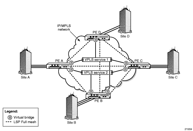 The VPLS architecture proposed in RFC 4664, Framework for Layer 2 Virtual Private Networks (L2VPNs) and RFC 4665, Service Requirements for Layer 2 Provider-Provisioned Virtual Private Networks, specifies the use of provider equipment (PE) that is capable of learning, bridging, and replicating on a per-VPLS basis. The PE routers that participate in the service are connected using MPLS LSP tunnels in a full mesh composed of mesh SDPs or based on an LSP hierarchy composed of mesh SDPs at the core and spoke SDPs as the access points.