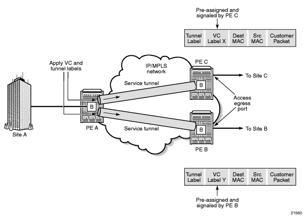Multiple VPLS instances can be offered over the same set of LSP tunnels. Signaling specified in RFC 4905, Encapsulation Methods for Transport of Layer 2 Frames over MPLS Networks, is used to negotiate a set of ingress and egress VC labels on a per-service basis. The VC labels are used by the PE routers for demultiplexing traffic arriving from different VPLS services over the same set of LSP tunnels.