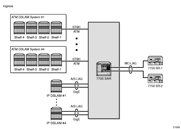 Figure 77 illustrates VPLS enhancements using an example of ATM DSLAM backhaul, where the 7705 SAR might not be used solely for DSLAM backhaul purposes or not all the services might be bound to VPLS. In Figure 77, colocated IP DSLAM (ISAM) traffic can also be transported by the 7705 SAR.