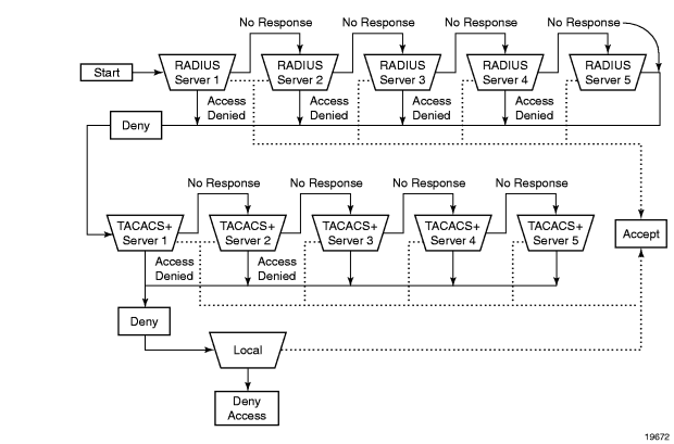 If any RADIUS server rejects the authentication request, it sends an access reject message to the router. In this case, no access request is issued to any other RADIUS servers. However, if other authentication methods such as TACACS+ and/or local are configured, then these methods are attempted. If no other authentication methods are configured, or all methods reject the authentication request, then access is denied.