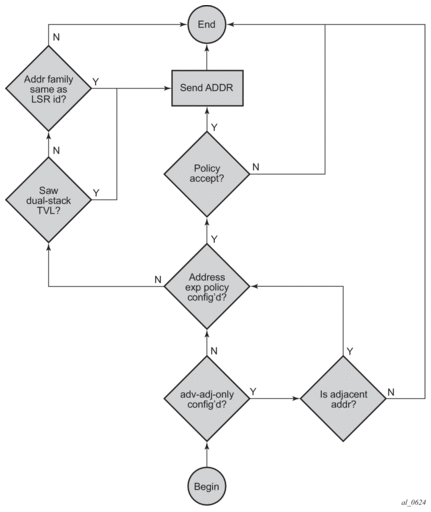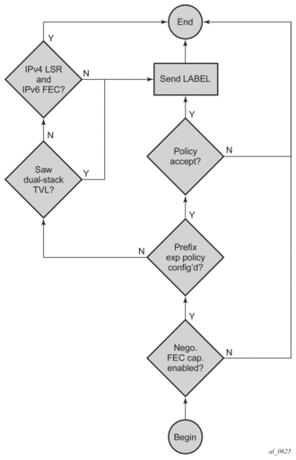 The above behavior applies to LDP IPv4 and IPv6 addresses and FECs. The procedure is summarized in the flowchart diagrams in Figure 102 and Figure 103.