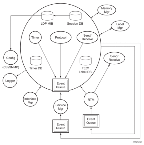 The LDP subsystems and their relationships to other subsystems are illustrated in Figure 62. This illustration shows the interaction of the LDP subsystem with other subsystems, including memory management, label management, service management, SNMP, interface management, and RTM. In addition, debugging capabilities are provided through the logger.