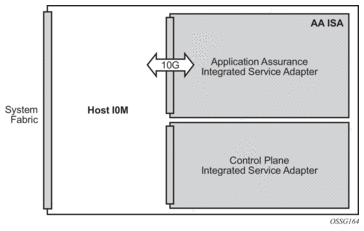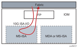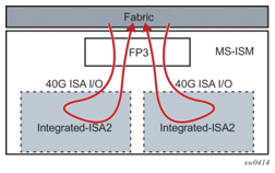 The MS-ISA fits in an MDA/ISA slot on an IOM and has no external ports, so all communication passes through the IOM, making use of the network processor complex on the host IOM for queuing and filtering functions like other MDAs and ISAs.