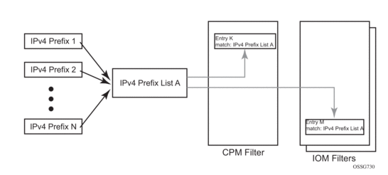 Figure 27 depicts how the IOM/CPM filter policy changes with a filter match list usage (using IPv4 address prefix list in this example).