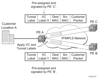 Multiple VPLS services can be offered over the same set of LSP tunnels. Signaling specified in RFC 4905, Encapsulation methods for transport of layer 2 frames over MPLS is used to negotiate a set of ingress and egress VC labels on a per-service basis. The VC labels are used by the PE routers for demultiplexing traffic arriving from different VPLS services over the same set of LSP tunnels.