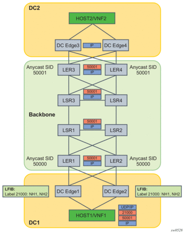 Host in DC1 pushes MPLS-over-UDP (or MPLS-over-GRE) header with outer IP destination address matching its local DC Edge1/2. It also pushes a static label 21000 which corresponds to the binding label of the static label route configured in DC Edge1/2 to reach remote DC Edge3/4 (anycast address). The bottom of the label stack is the anycast SID for the remote LER3/4.