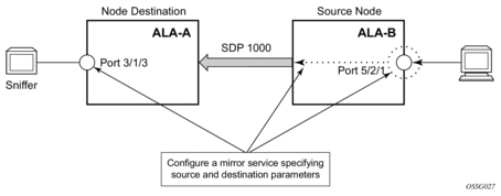Destination parameters are defined to specify where the mirrored traffic will be sent. In this case, mirrored traffic will be sent to a SAP configured as part of the mirror service on port 3/1/3 on ALA A (the mirror destination).