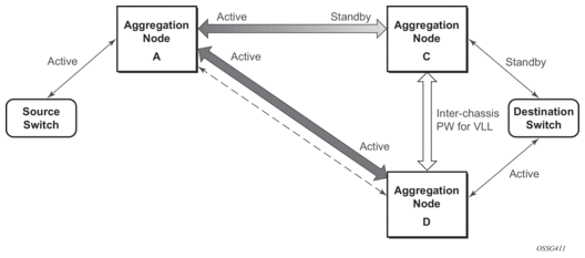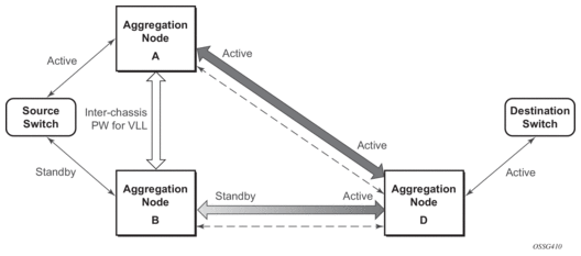 The notable difference with scenarios standard pseudo wire redundancy scenarios is that provided the customer service is redundant on nodes A and B (Figure 10 and Figure 11) both aggregation node A and Aggregation node B maintain an active Pseudo wire to Node D who in turn has an active link to the destination switch. If in the sample in Figure 10, the link between D and the destination switch is disconnected then both aggregation A and B must switch to use pseudowire connection to Node C.