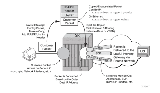 On the source node where LI mirroring occurs, the operator must configure the mirror-dest to inject into the routing instance (that is, base or VPRN) in which the actual destination address is reachable without having to hop into a different instance using GRT leaking. In other words the interface out which the packet will end up traveling must exist in the routing instance that is configured in the mirror-dest.