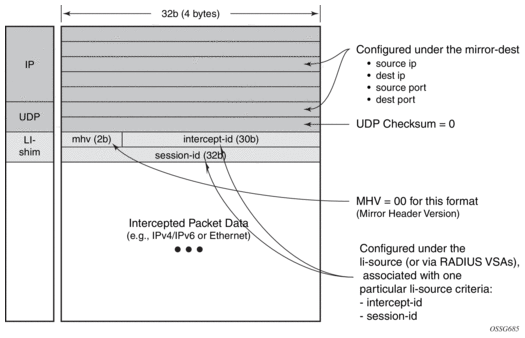 Note that for NAT based Lawful Intercept, routable LI encap is available, as well as the MAC or Layer 2-based encapsulation for NAT LI as configured under config>li>li-source>nat>ethernet-encap (applies to the 7450 ESS and 7750 SR)