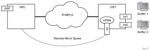 With remote IP mirroring, the mirror destination configuration can allow IP packets to be mirrored from a source router (Figure 5). The packets will be delivered to the destination in a spoke-terminated interface created in a VPRN service. IES interfaces are not supported. The interface can be configured with policy-based routing filters to allow sniffer selection based on incoming mirrored destination IP addresses. The interface cannot send traffic out as it is a destination only feature. Packets arriving at the interface will be routed based on the routing information within the VPRN. Policy-based routing should always be used unless only a sniffer is connected to the VPRN.