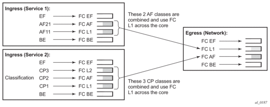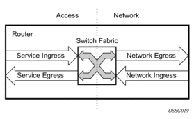 All router queues support the concept of in-profile, out-of-profile, together with inplus-profile and exceed-profile at egress only. The network QoS policy applied at network egress determines how or if the profile state is marked in packets transmitted into the service core network. If the profile state is marked in the service core packets, the packets are dropped preferentially at congestion points in the core as follows: