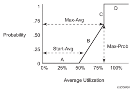 Plotting any value of shared buffer average utilization will result in a value for packet discard probability from 0 to 1. Changing the values for start-avg, max-avg, and max-prob allows the adaptation of the RED slope to the needs of the access or network queues using the shared portion of the buffer pool, including disabling the RED slope.