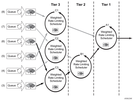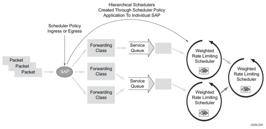 The use of the hierarchical scheduler policies is often referred to as hierarchical QoS or HQoS on the SR OS.